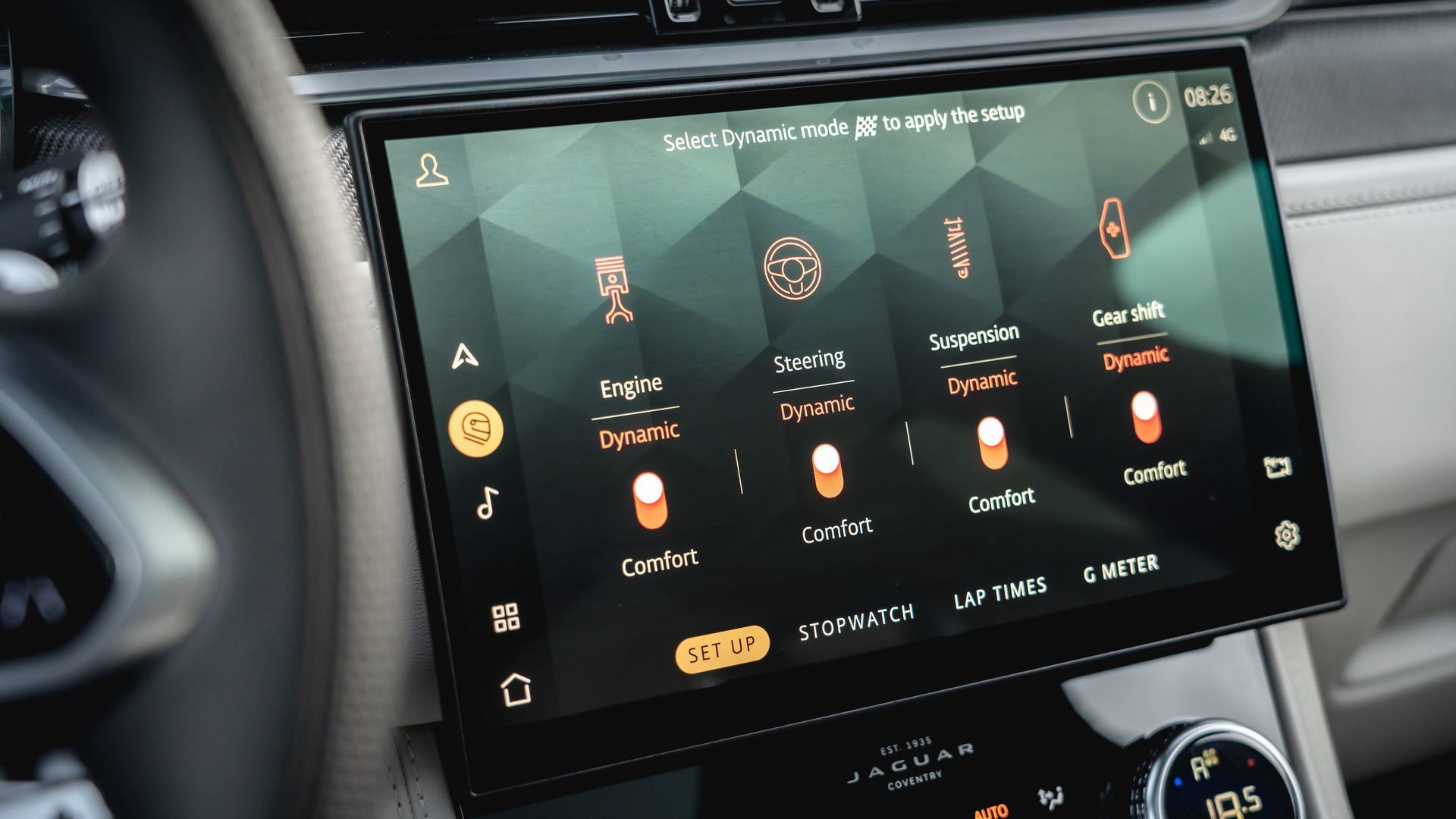 Le système Configurable Dynamics du F-PACE s'intègre parfaitement avec Adaptive Dynamics, offrant cinq modes distincts accessibles par commandes montées au volant :